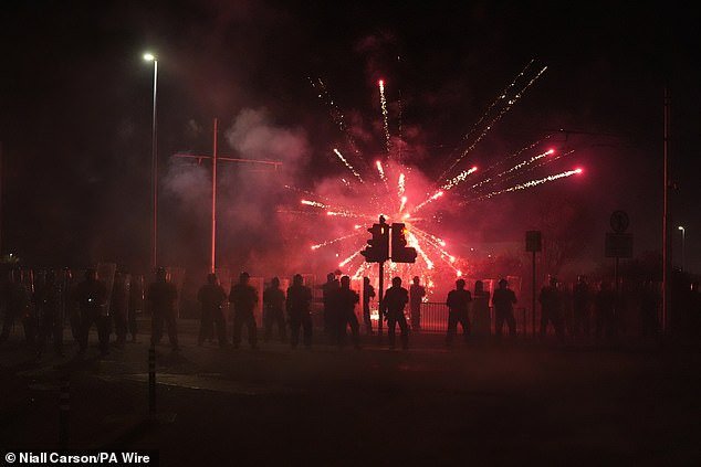 Los manifestantes lanzan fuegos artificiales a los agentes de Gardai cerca del hotel Citywest, mientras estallaban disturbios frente al hotel de Dublín que alguna vez albergó a solicitantes de asilo.