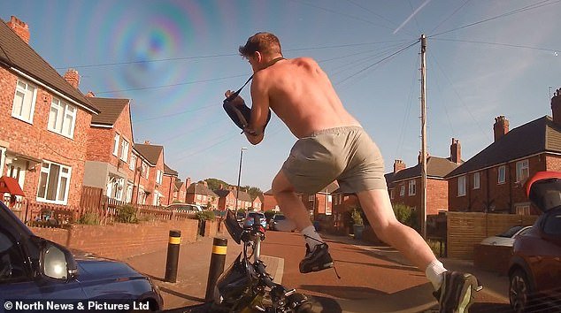 Un pícaro sin camisa se enfrentó a un “karma instantáneo” después de huir de la policía en una bicicleta eléctrica robada.