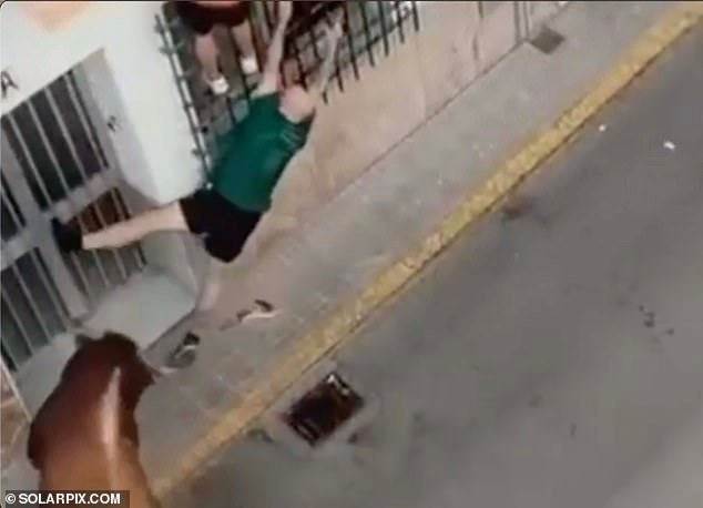 En las imágenes del incidente, demostró que solo estaba tratando de protegerse presionando pantalones cortos en rieles de metal con una ventana de apartamento en la planta baja con pantalones cortos y una camiseta antes de ser golpeado.