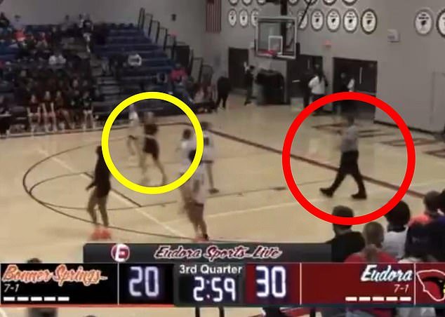 Un árbitro (círculo rojo) en un partido de baloncesto femenino de una escuela secundaria de Kansas expulsó a una jugadora (círculo amarillo) después de que ella pareció decirle algo.