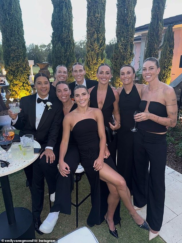 Los compañeros de equipo internacionales de Kerr habían viajado de todo el mundo para celebrar la boda de su patrón, con Steph Catley, Caitlin Foord, Emily Van Egmond, Alanna Kennedy y Mackenzie Arnold fotografiadas sonriendo para las fotos.