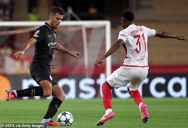 El mediocampista de Manchester City Rodri en acción contra Mónaco el miércoles … pero solo pudo manejar 60 minutos cuando se recupera de una operación de rodilla