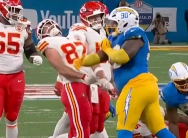 El defensor de los cargadores de Los Ángeles Tier Tart Travis Kelse se divirtió para golpear a su viral