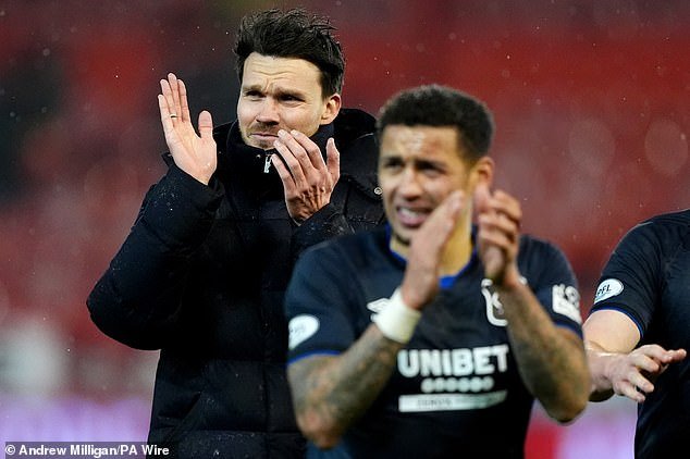 Danny Rohl con el capitán de los Rangers, James Tavernier, después de su victoria contra Aberdeen