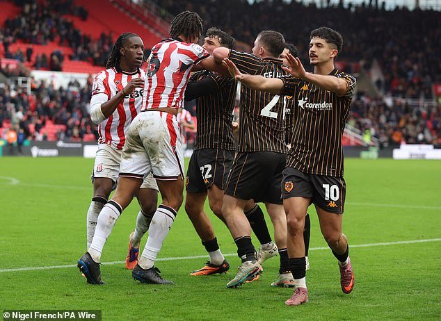 El choque por el campeonato entre Stoke y Hull terminó con una pelea en el campo provocada por las celebraciones de este último después de anotar un gol de la victoria en el último minuto.