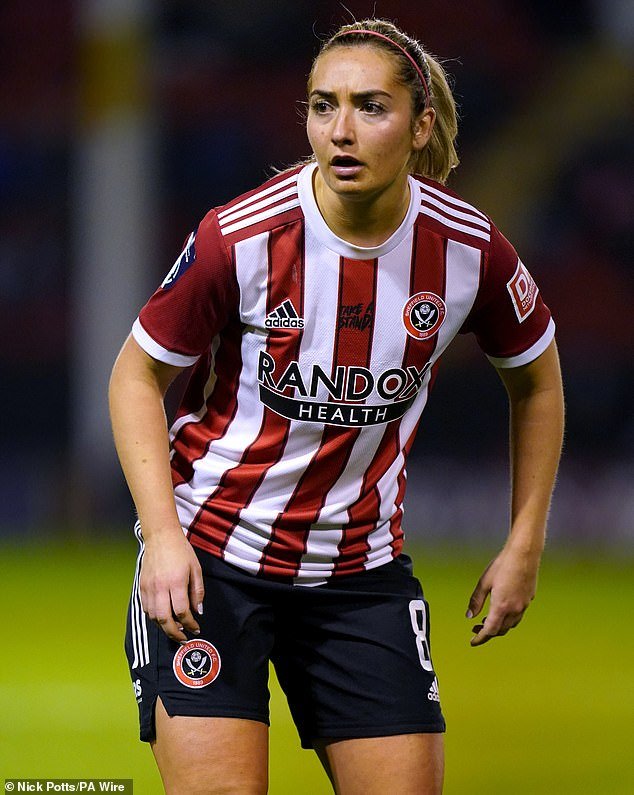 Cusack, que fue vicecapitana del Sheffield United Women, fue encontrada muerta en su casa en septiembre de 2023 (en la foto de arriba; los fanáticos rinden homenaje a Cusack en septiembre de 2025)