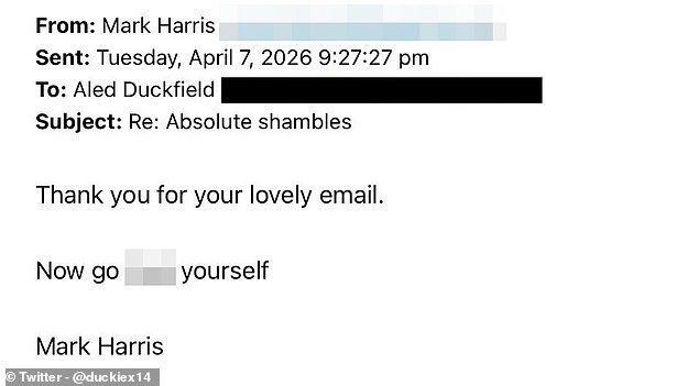 Aled Duckfield, que sigue al FC United, una rama del Manchester United, publicó una captura de pantalla de un correo electrónico que le envió el presidente de la Northern Premier League, Mark Harris, en el que se le entregaban consejos cargados de palabrotas.