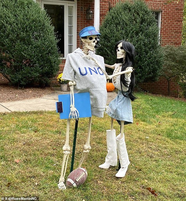 Como compartido en del podcaster Ross Martin, un fanático de Greensboro, Carolina del Norte, vistió un esqueleto de Belichick con una visera de la UNC y una sudadera con capucha de la UNC mientras sostenía un portapapeles azul.