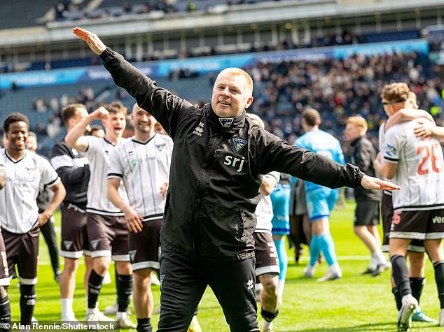 Neil Lennon saborea la victoria de Dunfermline en Hampden con su habitual celebración en avión