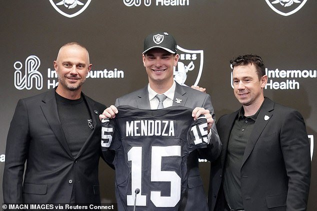 Mendoza, ganador del Trofeo Heisman y campeón nacional, lucía extasiado mientras posaba con su camiseta número 15 junto al entrenador en jefe de los Raiders, Klint Kubiak, y el gerente general, John Spytek.