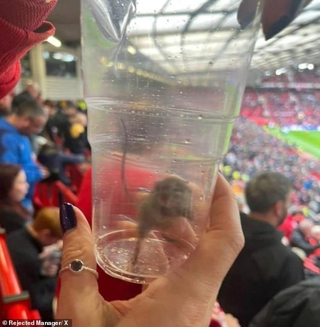 Compartiendo una foto del mouse atrapado dentro de una taza, un fanático escribió en X: “¿Cuál es la suciedad de Old Trafford? La mujer detrás acaba de llevar un ratón afuera en Old Trafford … me falta cosas que no he visto en el partido ahora …