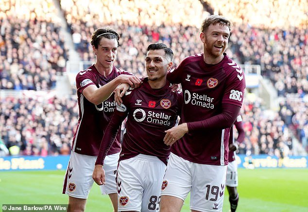 Alexandros Kyziridis celebra con sus compañeros después de que el Hearts tomara la delantera ante el United