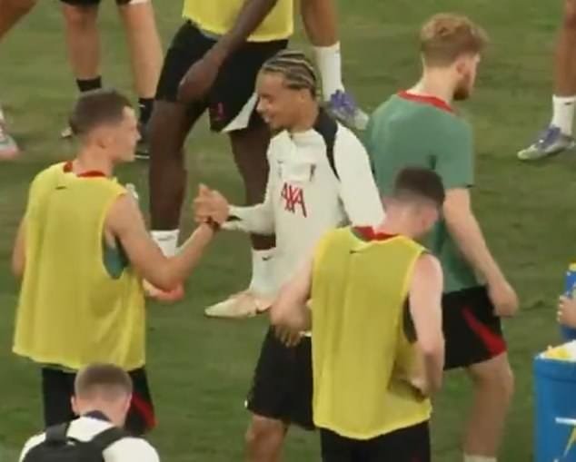 La cuenta oficial de Liverpool compartió imágenes en el campo para conocer a sus nuevos compañeros de equipo, y el gerente abraza a Arn Slot antes de estrechar la mano como Andy Robertson, Connor Bradley y Harvey Eliot.