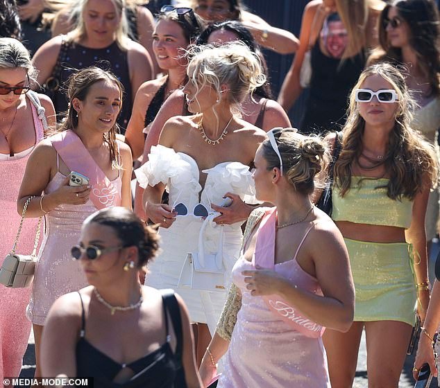 Kristi Wilkinson (vestida de blanco), la prometida de la superestrella de la NRL Tom Trbojevic, llega a Newport con amigos y familiares para su noche de chicas temática ‘Pilates y Prosecco’.