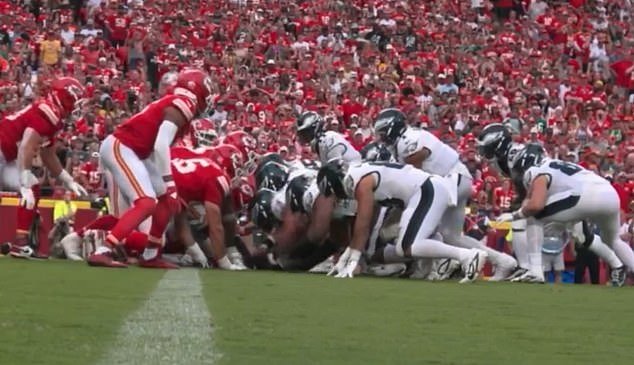 Pero los fanáticos de los Chiefs estaban furiosos después de que un releedor en la cámara lenta de esta pieza mostró que los jugadores de línea ofensiva de los Eagles habían saltado fuera de juego.