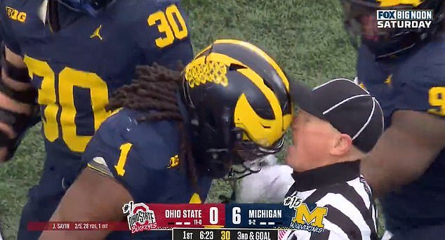 El apoyador de Michigan, Jaishawn Barham, sorprendió a los fanáticos cuando sorprendentemente le dio un cabezazo a un árbitro durante el juego del sábado.