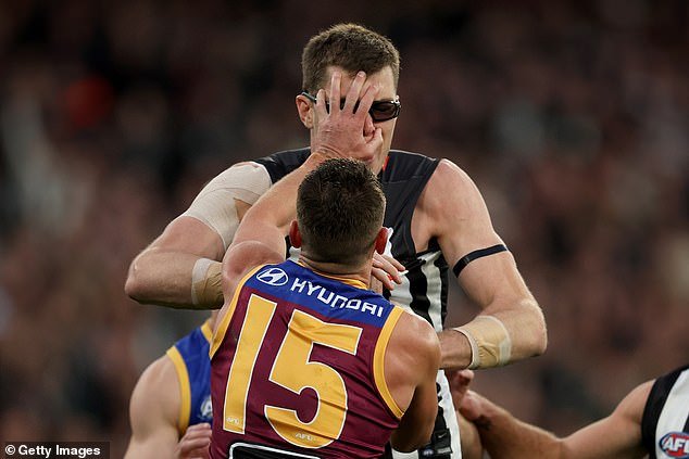 Dayne Zorko pareció atacar la cara de Mason Cox desde Collingwood en la emocionante final el sábado por la noche