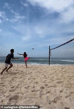 La esposa de Militao, Taina Castro Militao, mostró sus habilidades jugando footvolley playa, esencialmente voleibol pero con los pies y usando una pelota de fútbol.