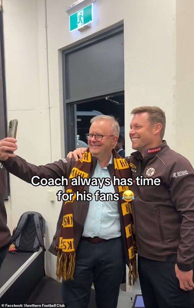 En el video, el primer ministro Antony Albanes Hawthorn demostró levantar una selfie rápida con el entrenador Sam Mitchell