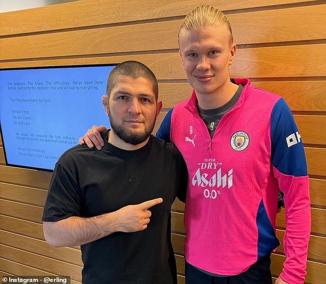 El mensaje, publicado detrás de Haaland y la leyenda de UFC Khabib Nurmagomedov, decía: “La presión. La caza. Las dificultades. Hemos estado aquí antes, llevados al límite absoluto y todavía aguantando todo”.