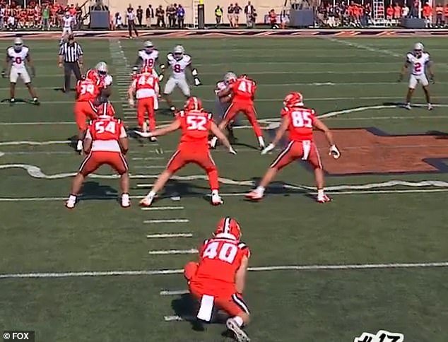 Se dictaminó que el pateador de despeje estaba donde su rodilla golpeó el campo, lo que significa que Illinois en realidad perdió 14 yardas en la jugada.