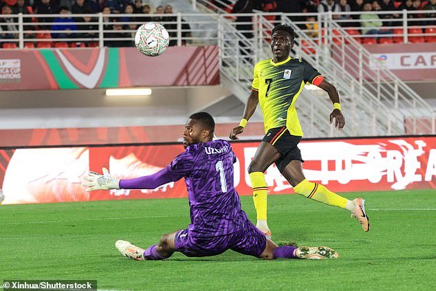El delantero ugandés Rogers Mato marca para su país contra Nigeria en la Copa Africana de Naciones