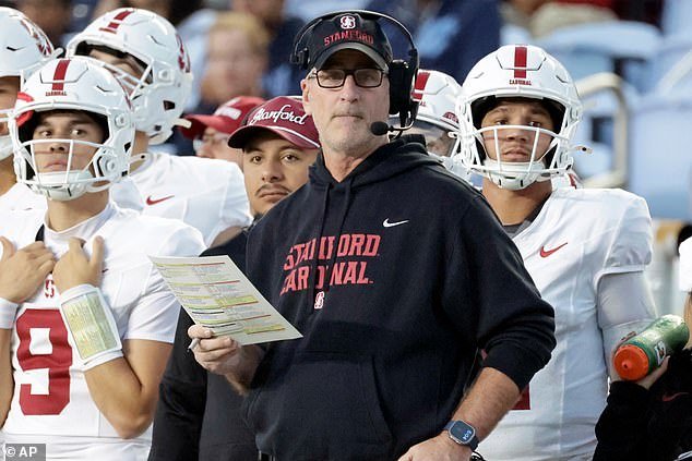 Frank Reich aparece al margen durante su papel como entrenador en jefe interino de Stanford.