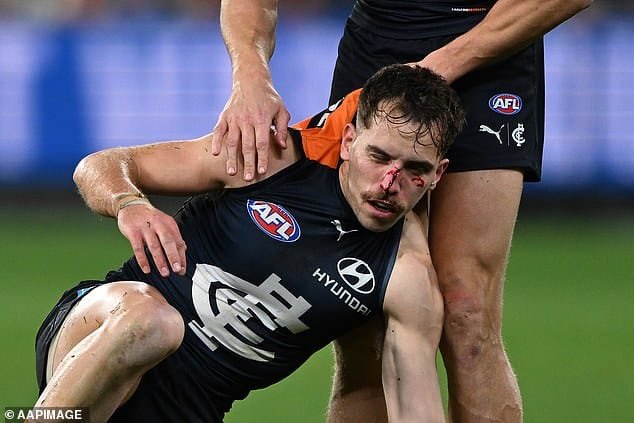 Según un ícono del pie, su golpe dejó a Francis Evans Blooded y el consumidor de Carlton (ilustrado) es parte de los planes para sacar a Francis Evans de Francis Evans en su golpe dejó a Carlton, su estrella Steven May Sughing se da a su estrella Steven May.
