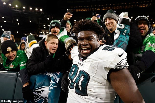 Jordan Davis celebra con los fanáticos de los Philadelphia Eagles después de vencer a los Packers en noviembre