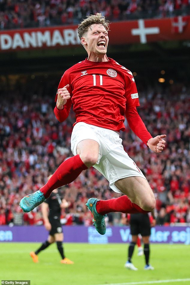 Andreas Skov Olsen, celebrando su gol con Dinamarca, se acerca al Rangers