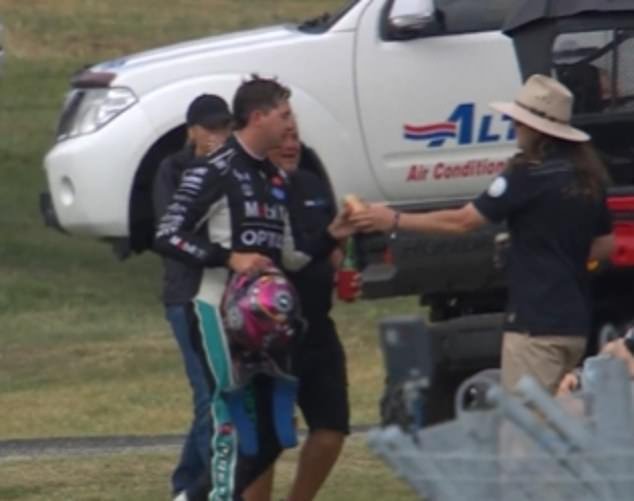 En la foto: El momento en que un fanático de las carreras le da al piloto de Bathurst 1000, Chaz Mostert, una cerveza fría después de que un problema de motor arruinó su carrera el domingo.