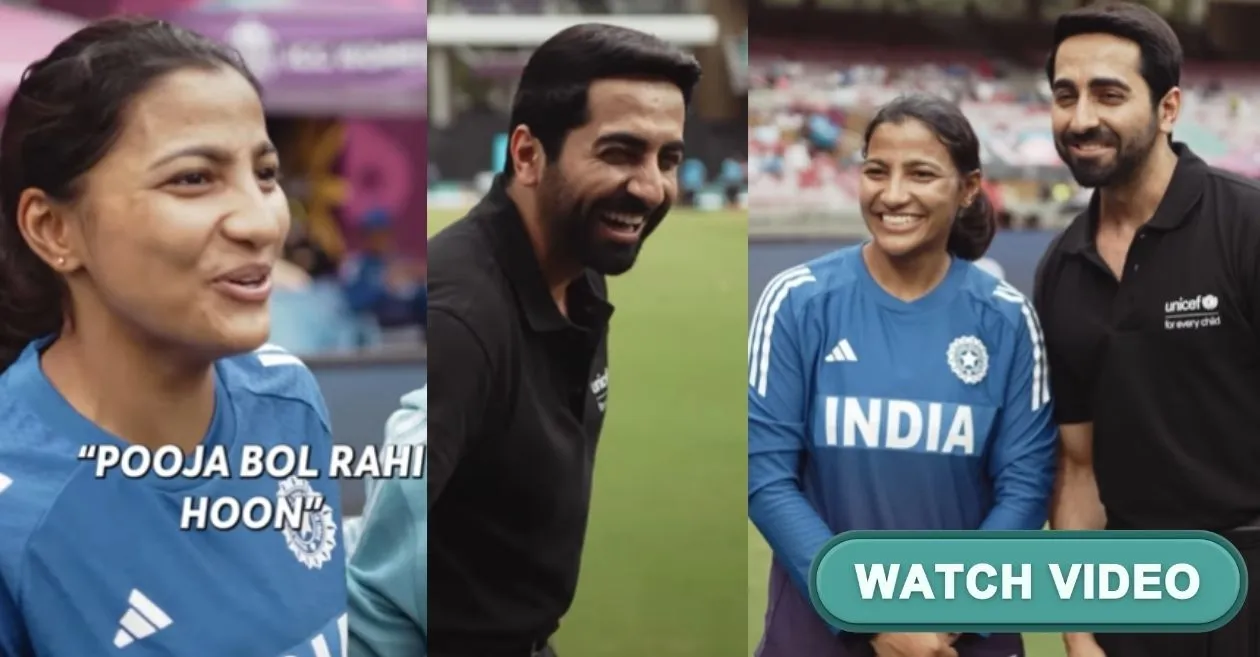 El vídeo parece capturar momentos sinceros previos al partido en los que Khurrana entabla una conversación alegre con miembros del equipo de críquet femenino de la India y representantes de UNICEF en Navi Mumbai. El diálogo incluye bromas amistosas centradas en la frase “Mi Pooja está muy feliz,“probablemente refiriéndose a una línea humorística o popular en la obra de Khurrana. Pooja Vastrakar participa en este intercambio, y el tono es alegre y juguetón.