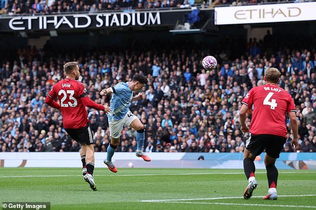 La brillante competencia de Jeremy Doku en la primera mitad lo vio saltar por la tensa pierna de Shaw cuando su cruz finalmente encontró su camino hacia Phil Foden, quien se dirigía a hacerlo 1-0.
