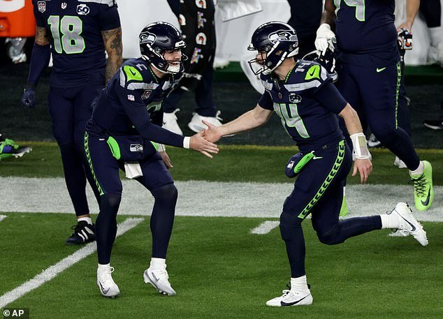 Durante largos períodos de este enfrentamiento, Darnold también estuvo encadenado. Y luego, 90 segundos después del último cuarto, el jugador de 28 años completó un pase hacia la zona de anotación. En los brazos de AJ Barner. Darnold se alejó y sus compañeros de equipo salieron corriendo de los bancos y se dirigieron hacia su mariscal de campo.