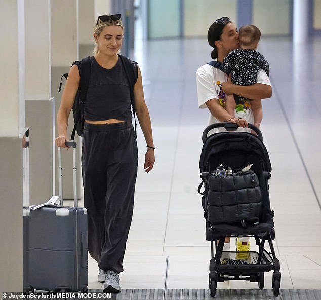 Sam Kerr compartió un tierno momento con su hijo Jagger cuando ella y su esposa Kristie Mewis dejaron Perth después de su boda en la víspera de Año Nuevo.