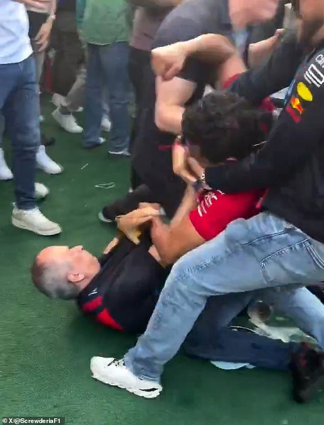 Un hombre que vestía los colores de Ferrari intercambió golpes con otro que vestía una camiseta de Red Bull antes de que varios más se unieran. En otra pelea, un espectador recibió patadas mientras estaba en el suelo mientras se rociaba cerveza en el vestíbulo.