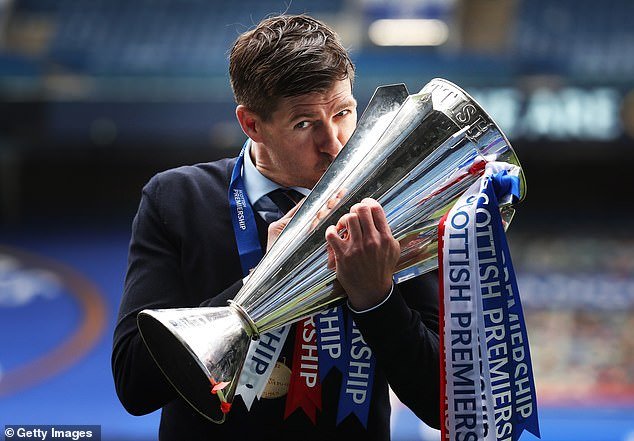 Steven Gerrard besa el trofeo de la Premiership escocesa tras llevar al Rangers al título en 2021