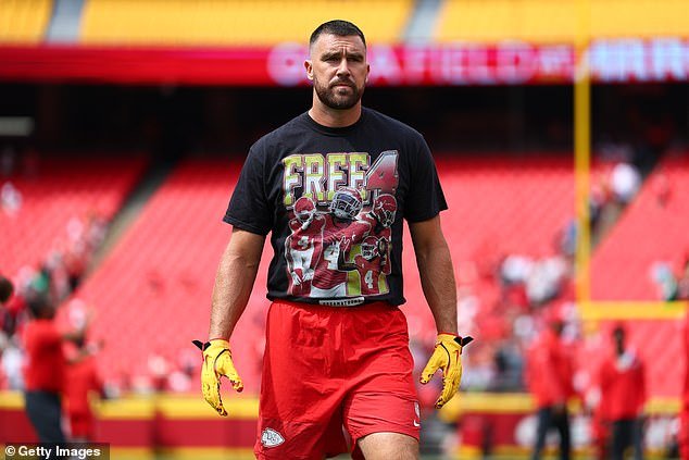 Kelce salió al suelo con una camisa que tenía varias imágenes del receptor principal, así como la oración “gratuita 4”.